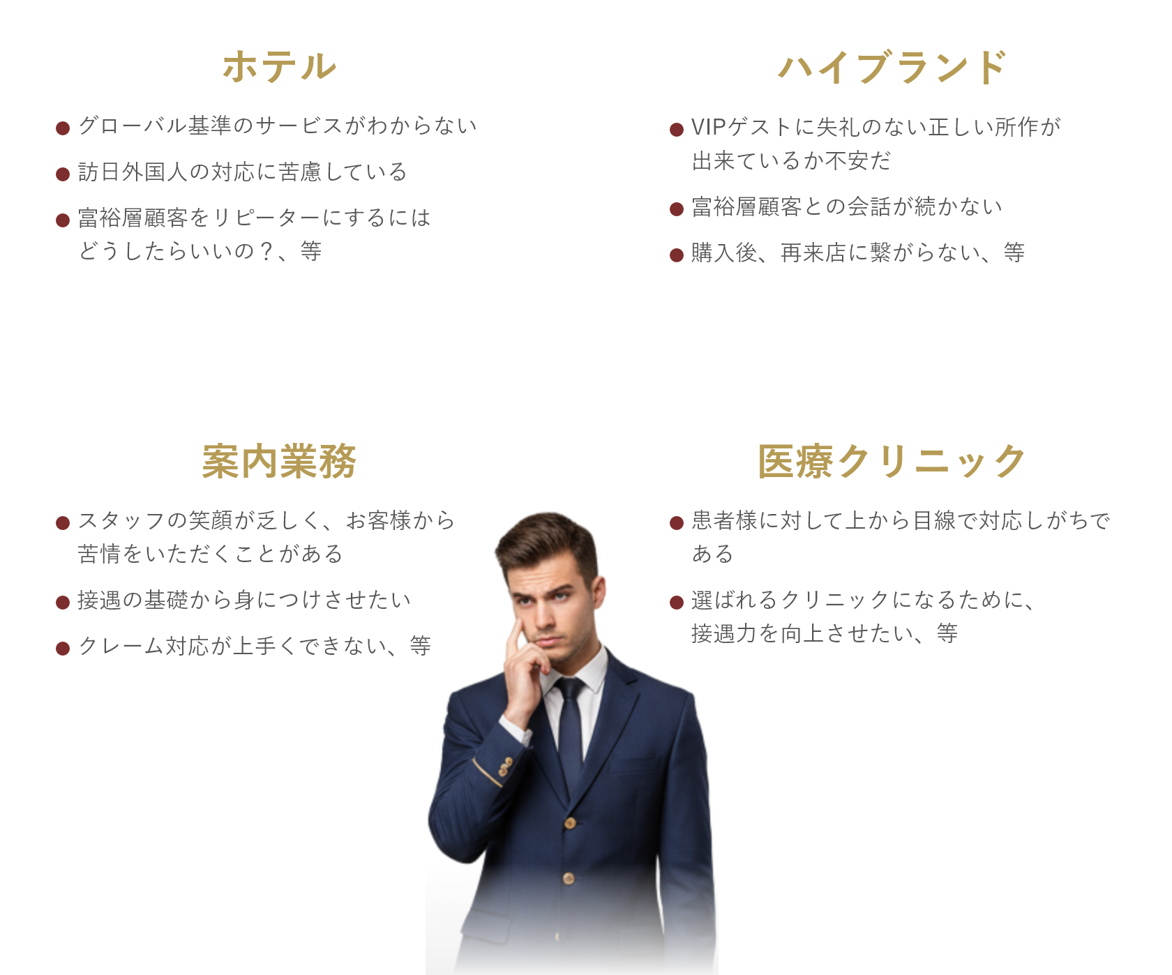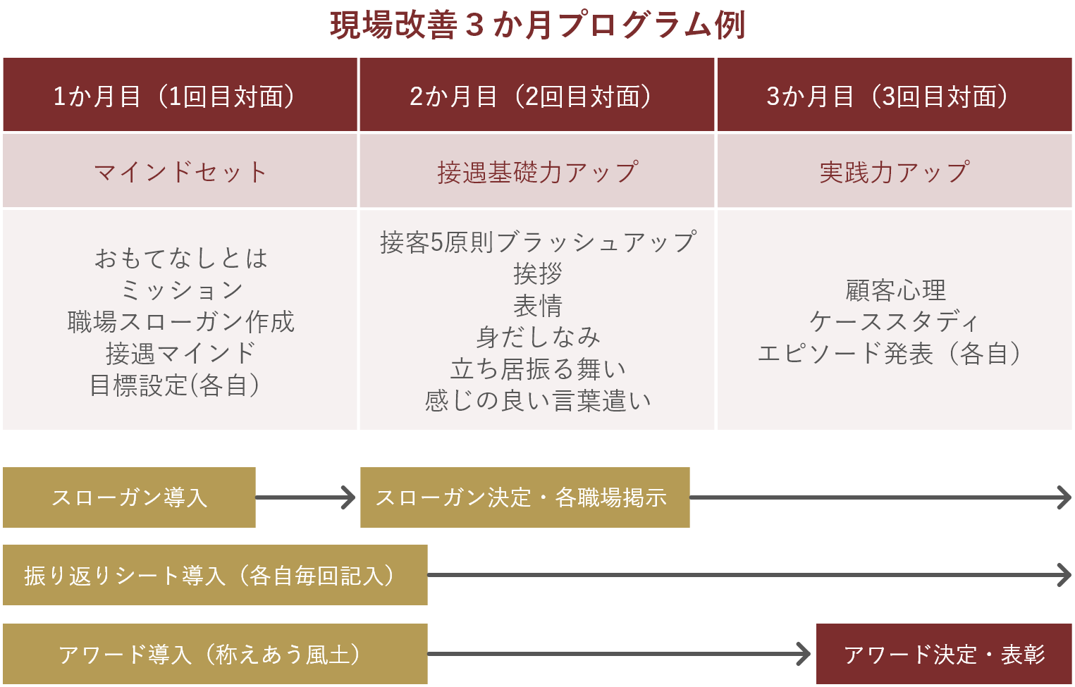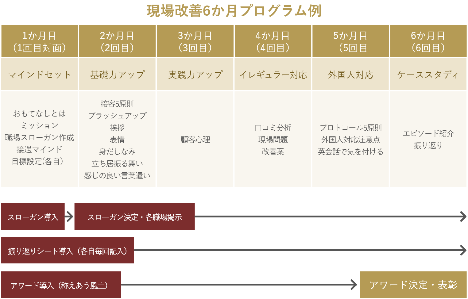 当アカデミーの特徴は、名前の如く、お客様だけでなくサービススタッフの心を満たすことを大切にしています。長年の経験からスタッフの心が満たされていないと、心のこもったおもてなしは出来ないからです。スタッフが心からの笑顔でサービスをすれば、自ずとお客様はリピートしてくださり売上も自然と上がることでしょう。